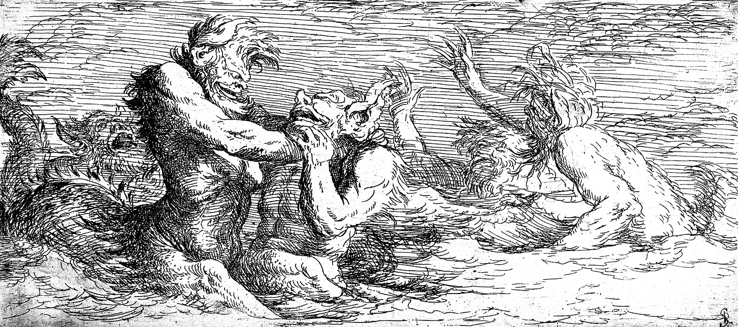A mass of dead fish, floating on the water. They’ve attracted sharks, and they’re gorging on them. A small trading skiff is caught in the turmoil.